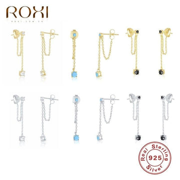 ROXI Bohemia White Black Blue Green Red Zircon Link Chain Stud Earrings for Women Girls Wedding Earrings Piercing Silver 925