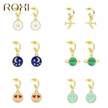 ROXI Colorful Cartoon Star Moon Planet Stud Earrings For Women C Shape Earring Piercing 925 Sterling Silver Pendientes Plata 925