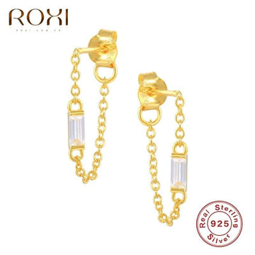 ROXI Rectangle Zircon Crystals Tassel Chain Stud Earrings for Women Girls Casual Piercing Earring 925 Sterling Silver Pendientes
