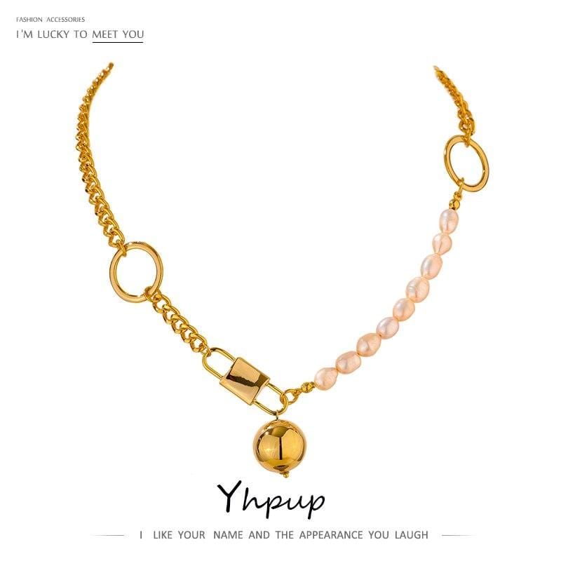 Yhpup Occident Lock Ball Pendant Necklace Luxury Natural Pearl Jewelry Trendy Metal Temperament Choker Necklace for Women Gift