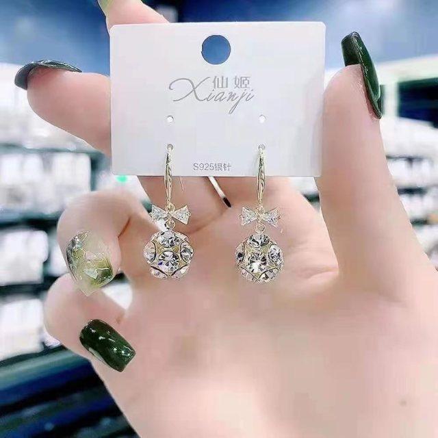 2021 new fashion summer purple shiny round bead pendant earrings fashion temperament wild bow earrings female gift jewelry