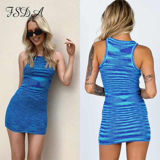 FSDA 2021 V Neck Knitted Dress Bodycon Blue Women Halter Neck Backless Bandage Summer Beach Sleeveless Sexy Mini Dresses Y2K