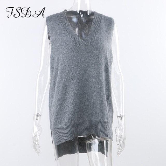 FSDA V Neck 2020 Women Split Vest Sweater Dress Sleeveless Gray Autumn Winter Loose Casual Knitted Jumper Oversized Pullover